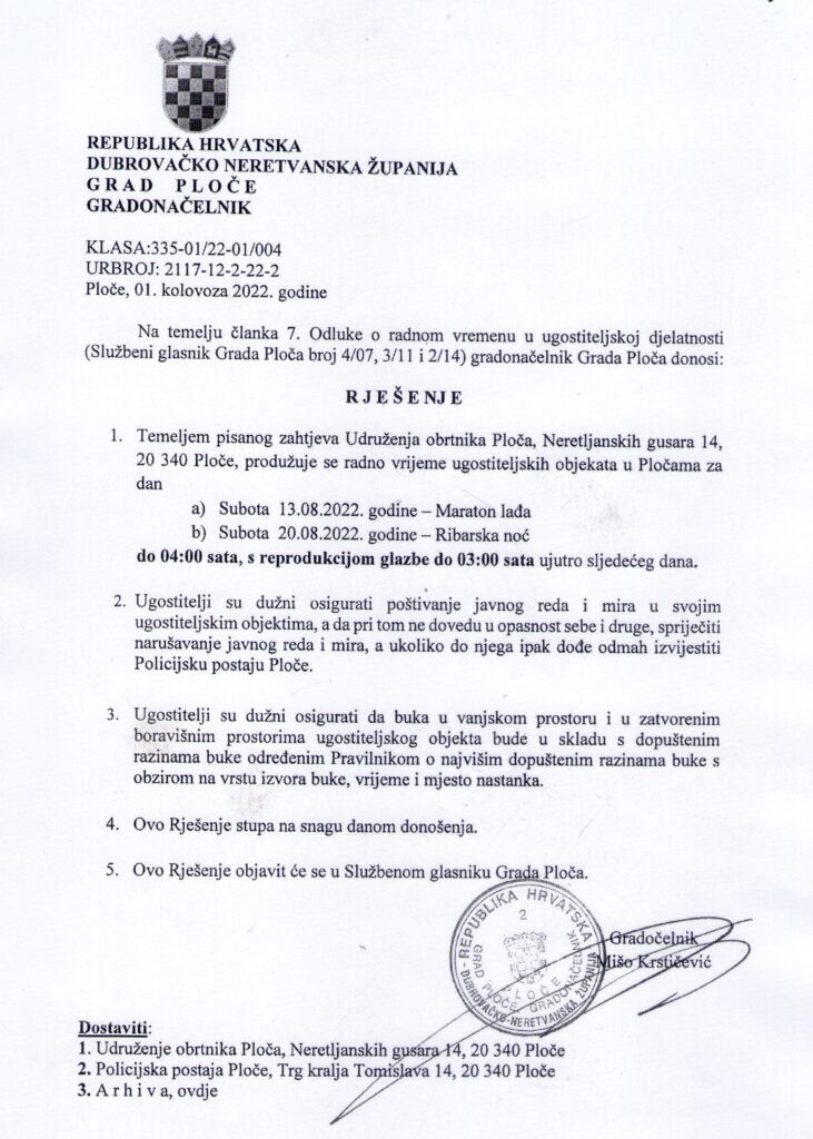 Rješenje o radnom vremenu za Maraton lađa i Ribarsku noć 2022